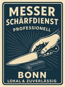 | France Manufactur, Bonn, Februar 2026 Auch Taschenmesser und Klappmesser. Preise: ab 14,90€ inkl. MwSt. (gewerblich, siehe rechtliche Angaben). Einfach in Beuel oder Kessenich vorbeibringen. Japan Messer und traditionelle westliche Messer schärfen lassen Japan Messer werden extrem scharf. Das kommt durch ihren speziellen Winkel von 15 Grad (15°). Auch diesen Winkel schleift unser Messerschleifer in Bonn-Beuel und Bonn-Kessenich. Also einfach her mit Ihren japanischen Messern zum Schleifen und Schärfen lassen! Messer schärfen als Service: Dass wir die üblichen europäischen und sonstigen westlichen Messervarianten und Klingen mit ihrem 20 Grad-Winkel (20°) beherrschen, versteht sich quasi von selbst. Wir freuen uns darauf, Ihre guten Stücke für Sie zu schärfen. Damit das Arbeiten damit endlich wieder Freude bereitet und sogar Spaß macht! Persönlich abgeben: Messer schärfen in Bonn-Beuel und Kessenich Selbstverständlich können alle Besitzer von hochwertigen oder liebgewonnenen Messern ihre guten Stücke einfach persönlich nach Bonn-Beuel oder Kessenich bringen. Diesen Service bieten wir ebenso an für das Schärfen von